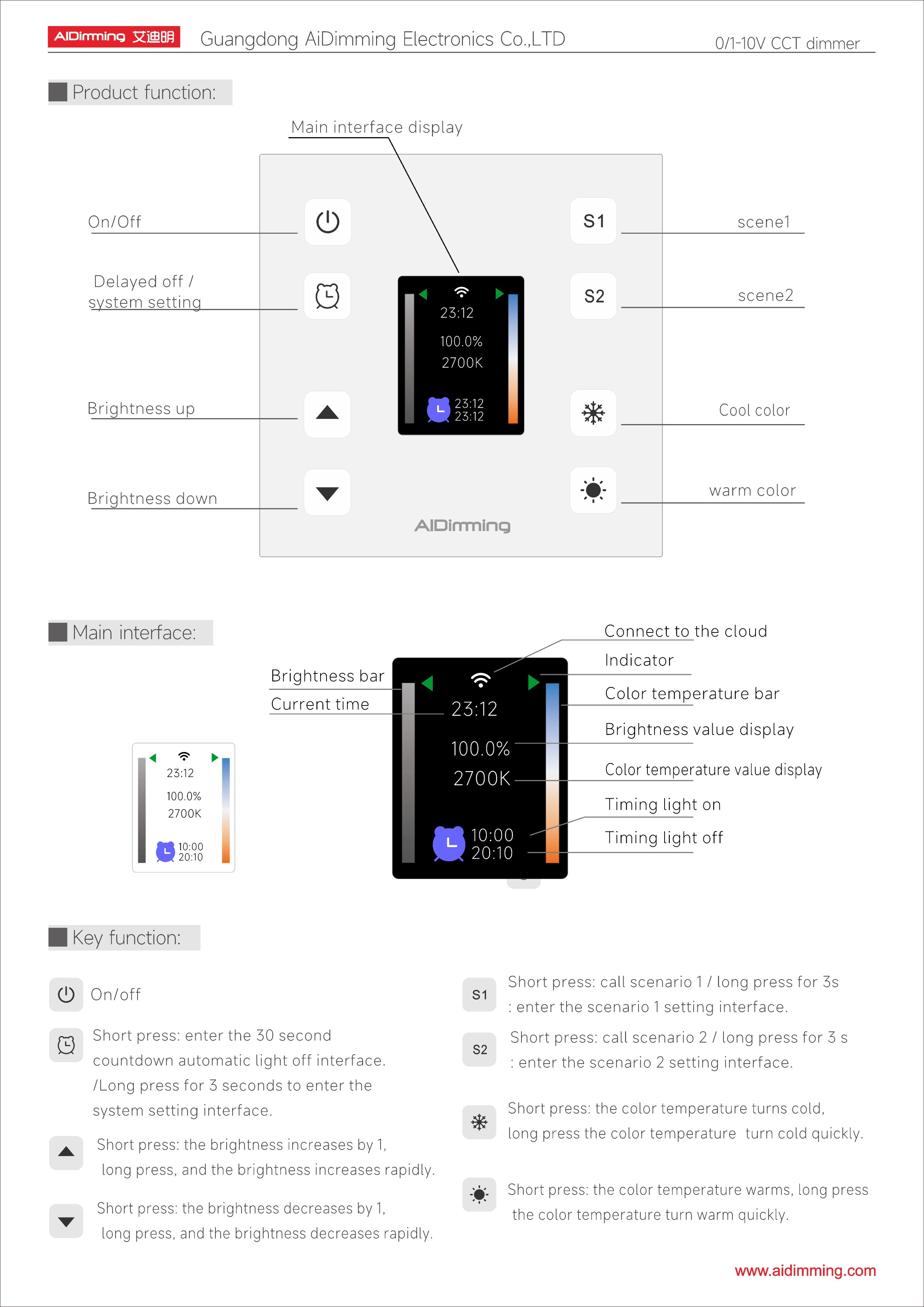 The AiDiming PE-X1-10V is a modern 0/1-10V dimming and color temperature control panel designed for precision lighting management in both residential and commercial spaces. With an intuitive HD touch screen interface and a durable tempered glass finish, it supports active/passive signal output, scene customization, app control, and offline voice operation.