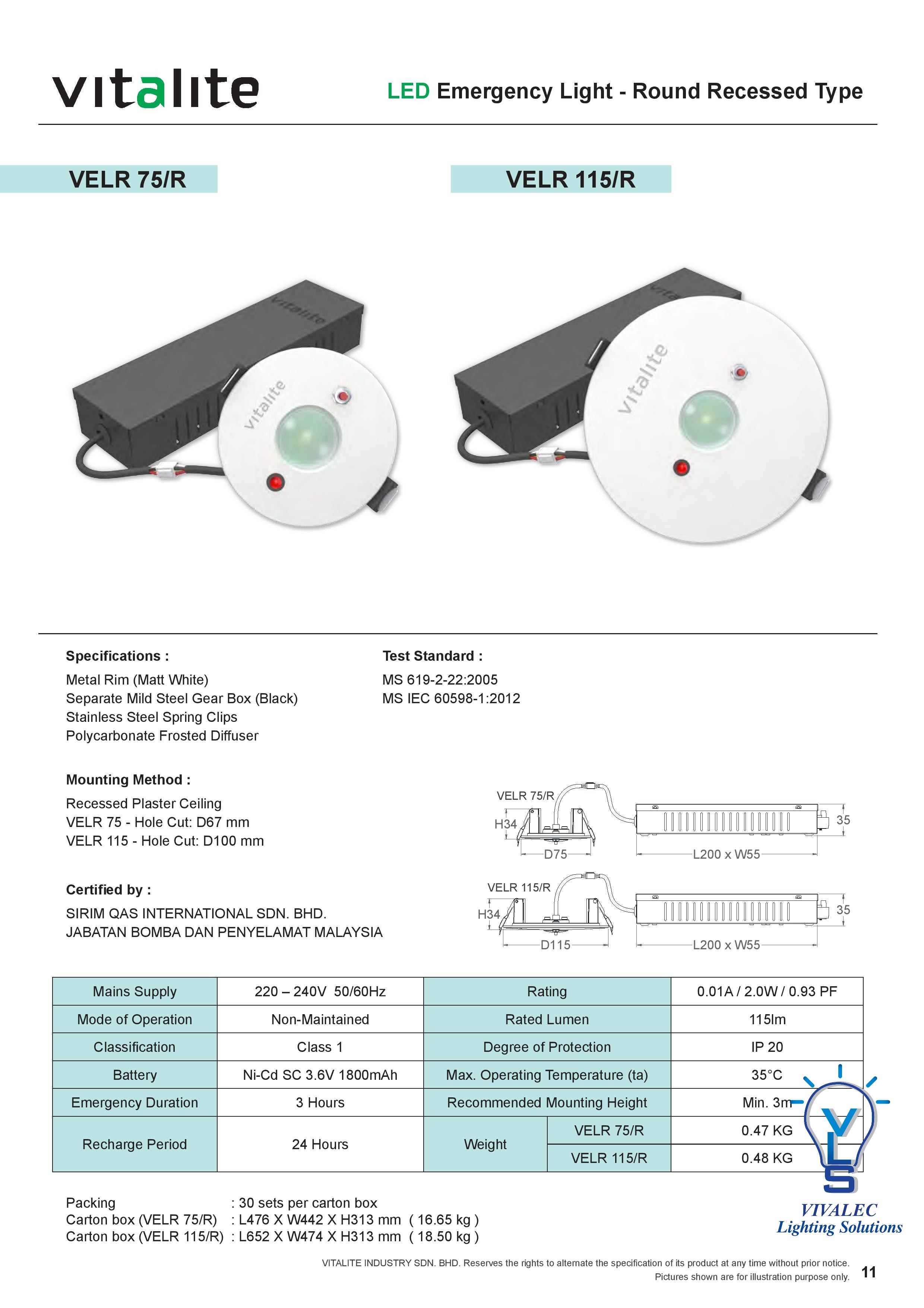 LED Emergency Light – Round Recessed Type VELR 75/R ,VELR 115/R