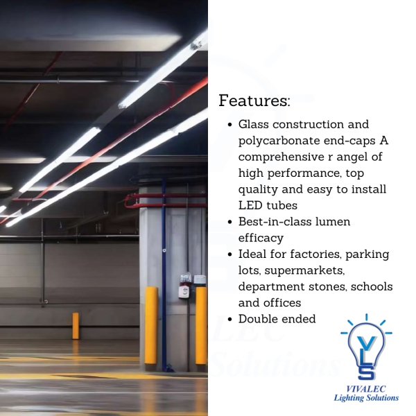 - Glass construction and polycarbonate end-caps A comprehensive r angel of high performance, top quality and easy to install LED tubes