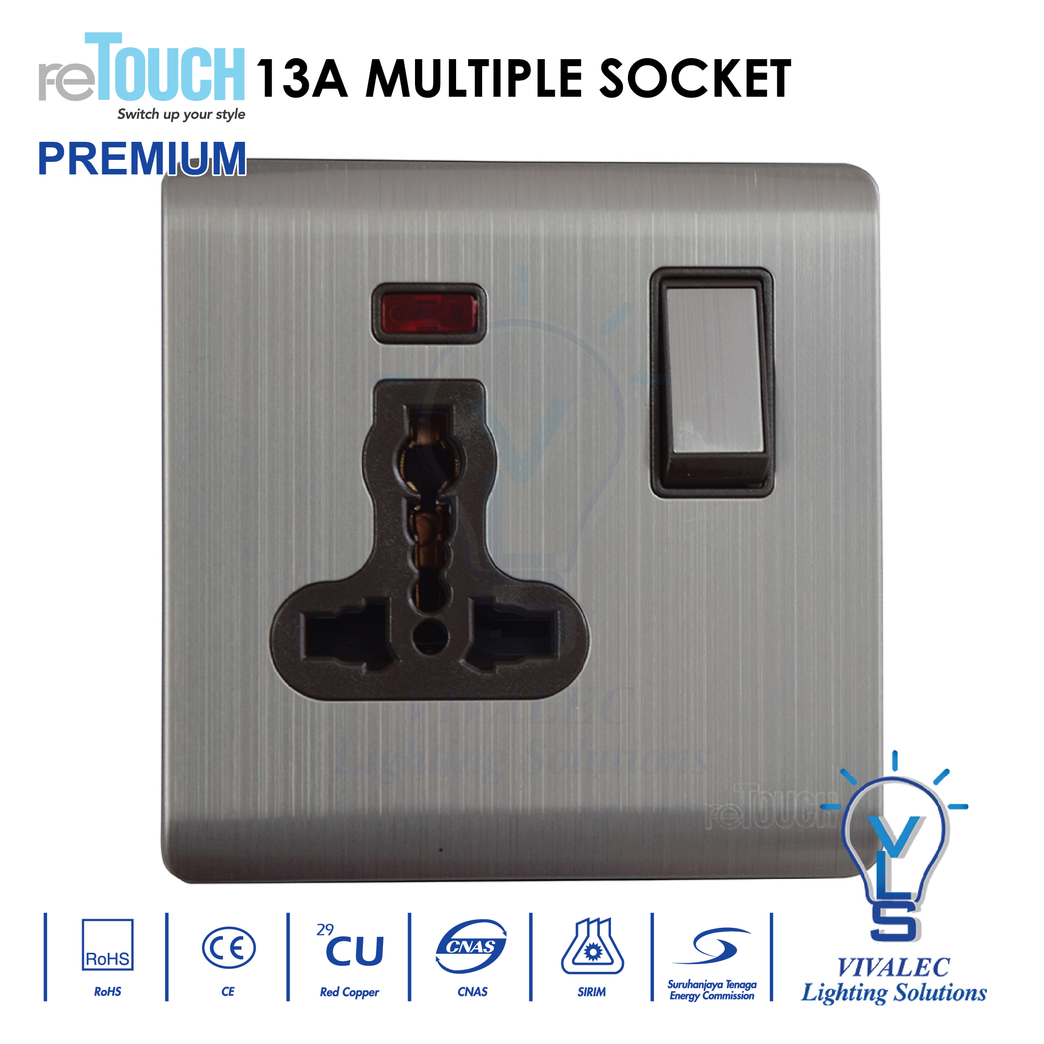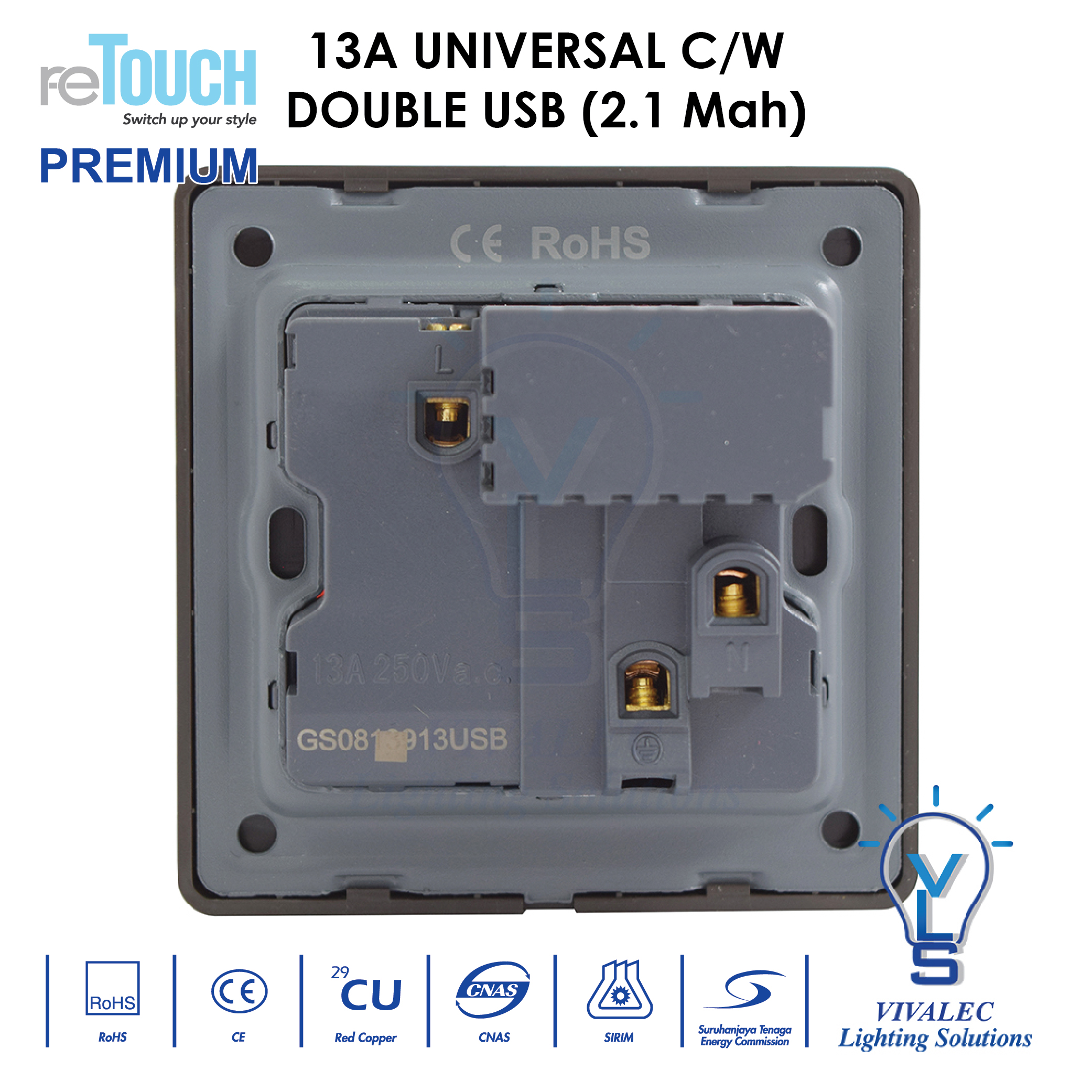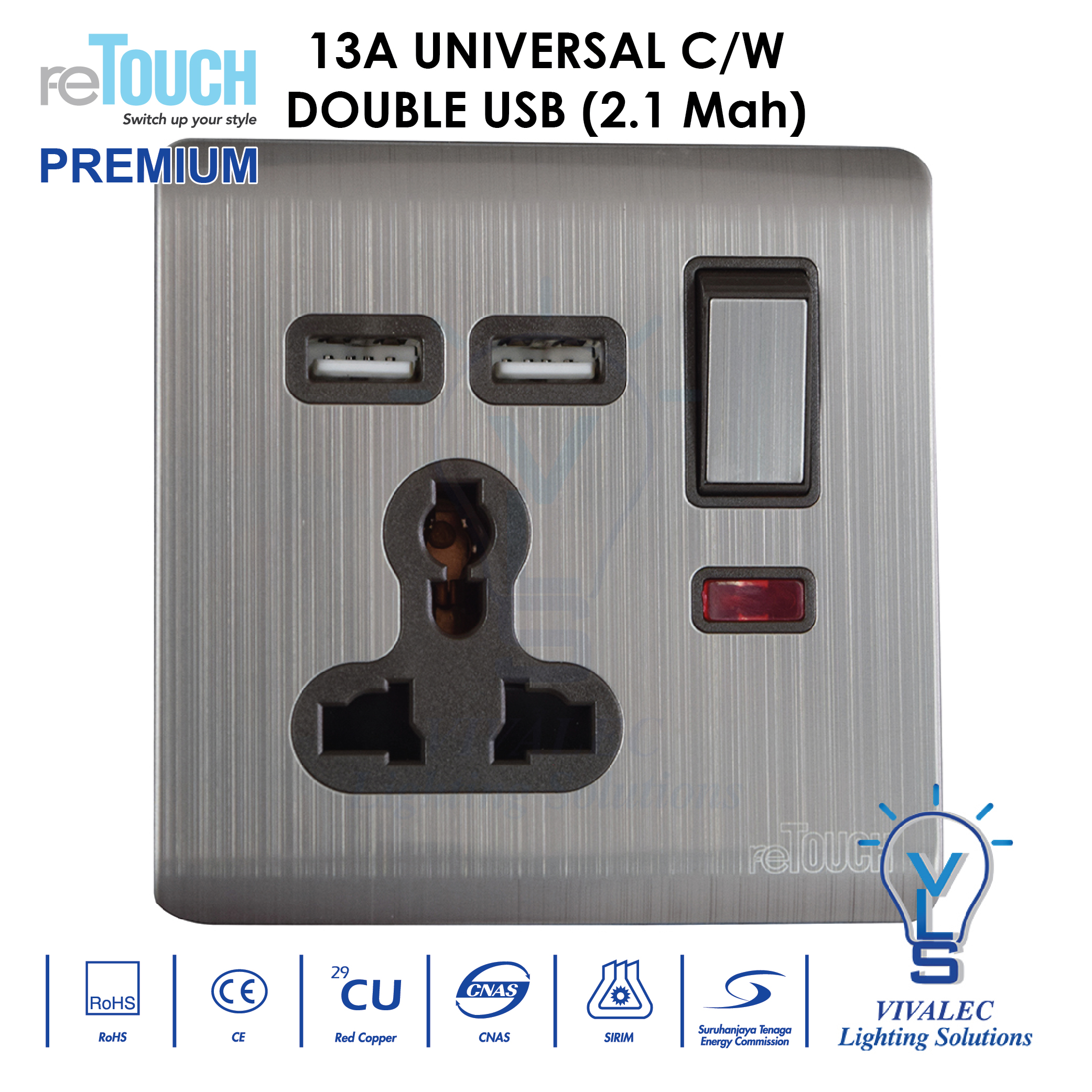 - 13A multiple socket with double USB outlet (2.1MAh)